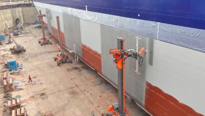 傳統的船體除銹、噴涂作業,長期依賴人工,效率低、成本高、品質差,還面臨嚴重的安全與環保問題。鼎力創新性地將高空作業平臺與機器人技術深度融合,打造了一套集成化的智能作業系統,真正實現均勻、高效的除銹與噴涂作業,徹底解決了行業痛點,為全球船舶修造業樹立了智能化轉型的標桿。